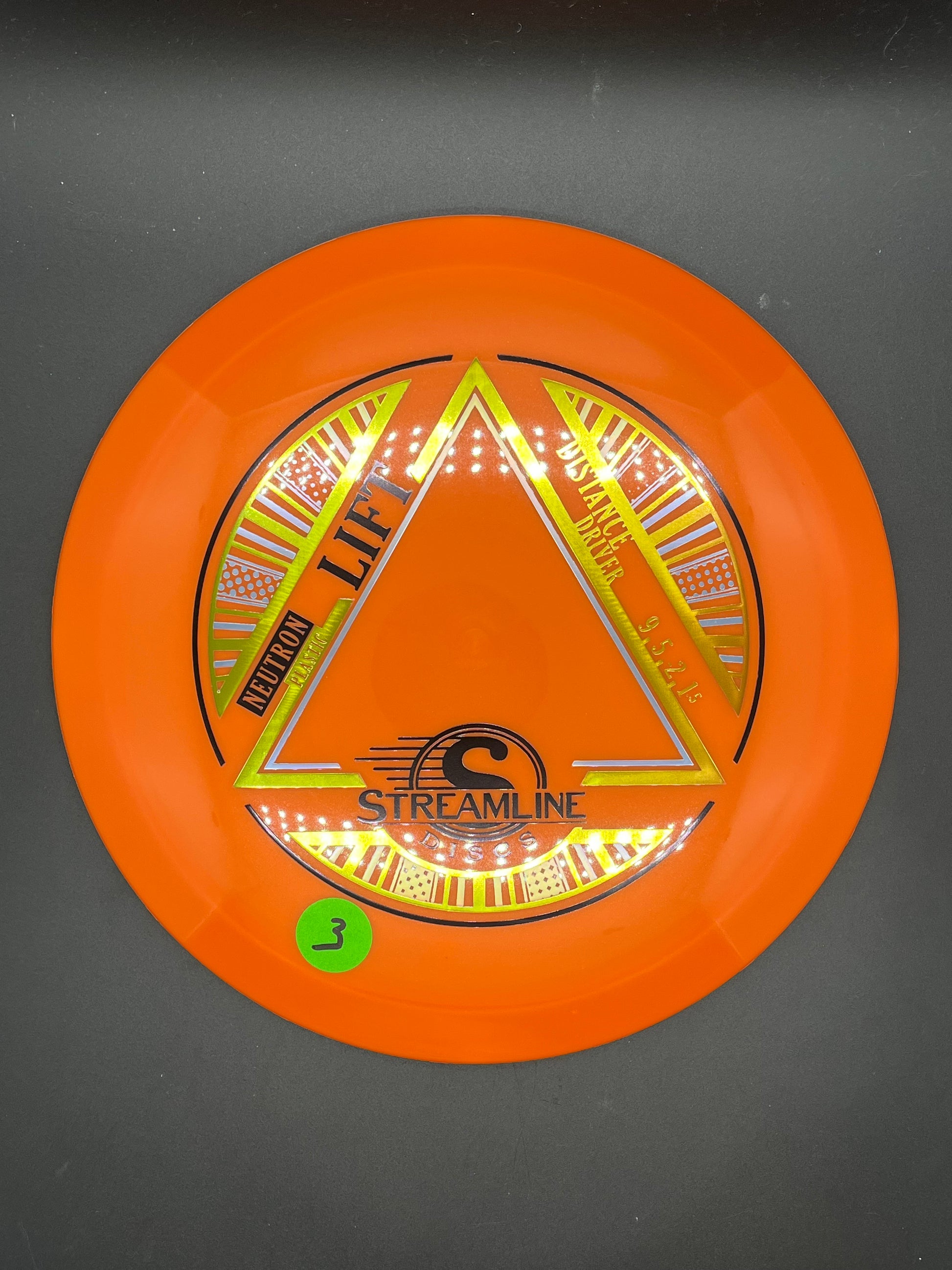 The Lift is Streamline’s understable distance driver, designed as a straight flying driver with a comfortable rim size and slightly domed profile. It is the second disc along with the Flare in the 19mm Speed 9 Driver Class for Streamline. In Streamline Neutron Plastic the Lift has premium grip and durability, along with a huge variety of Neutron and Cosmic Neutron color options. For controllable flight lines with effortless glide, activate Bernoulli’s principle with the Streamline Neutron, Proton and Cosmic Neutron Lift!